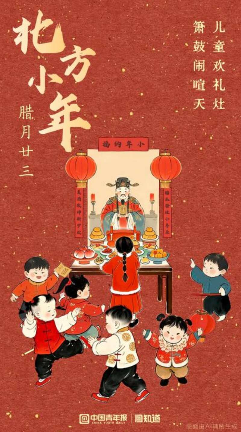 “儿童欢礼灶,箫鼓闹喧天。”腊月二十三,是热闹温馨的北方小年。人们用甜蜜的灶糖“祭灶”,祈愿灶神“上天言好事”;大扫除扫去一年的尘埃,迎来洁净与希望。窗花映照盈盈笑意,饺子承载团圆的期盼。这一天,春节的序幕拉开,家的温暖、年的味道就要到来。